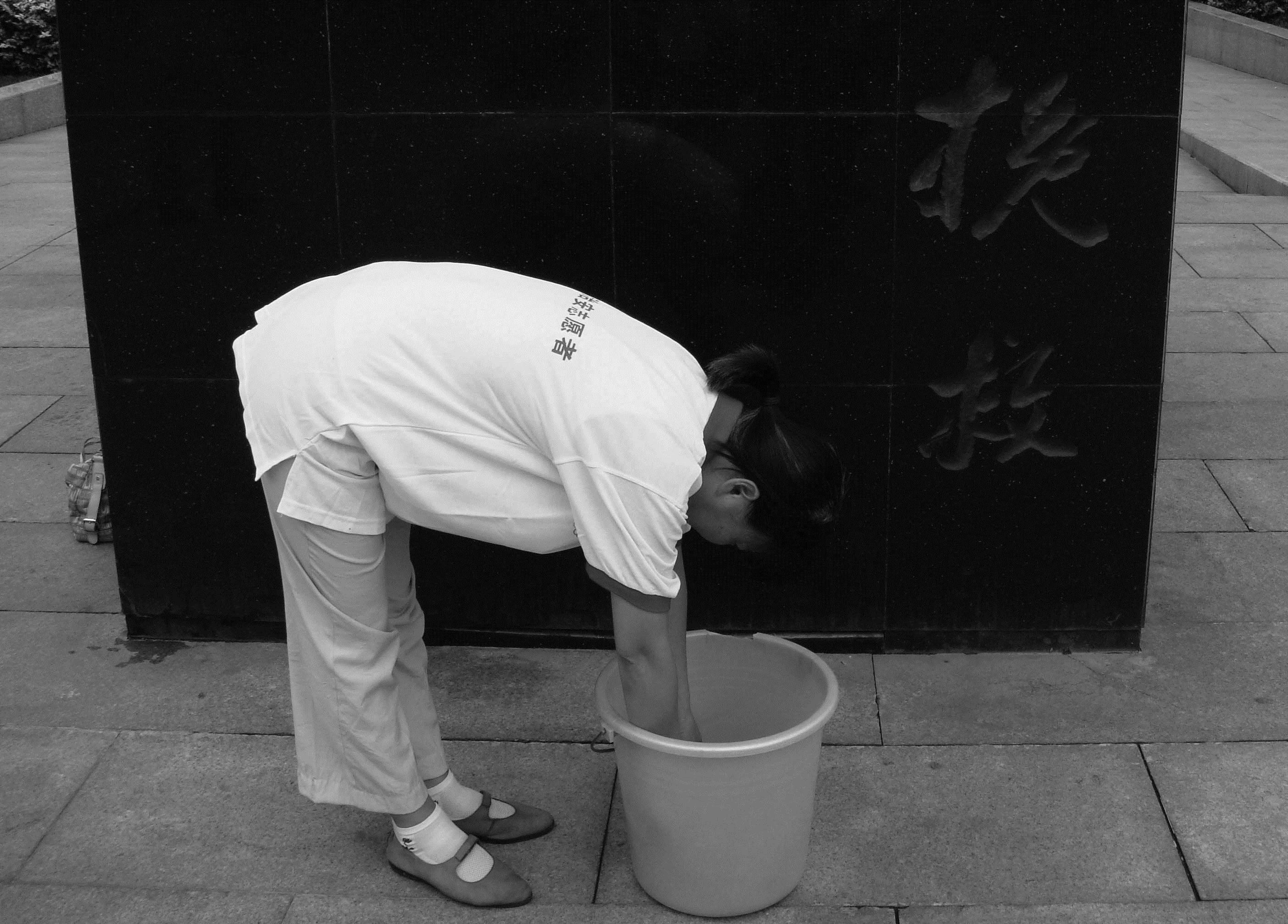 女劳教人员打饭规范动作模拟照。摄于北京市劳教局门前