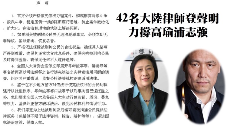42名大陸律師登聲明力撐高瑜浦志強 要求官方棄「穩定壓倒一切」思維