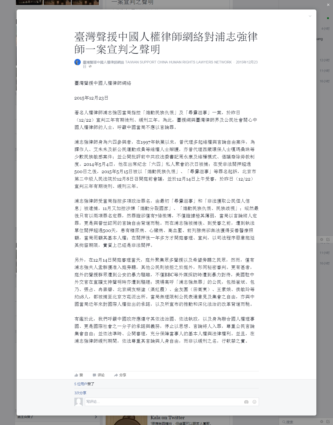 台湾声援中国人权律师网络:对浦志强律师一案宣判之声明