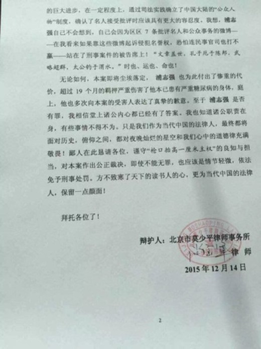 浦志强代理律师尚宝军一审补充辩护词:盼公正裁决 免刑事处罚