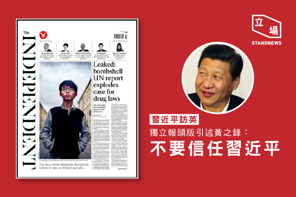 在習近平抵達英國訪問的同一天,英國《獨立報》以極大篇幅在頭版刊出香港學民思潮召集人黃之鋒的照片