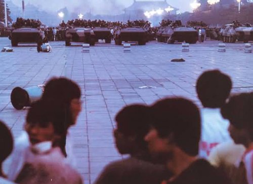 军队伪装进城自然是火上浇油,人人都坐不住了。笔者于下午二时半提前下班去天安门。行至天安门广场,但见有组织的队伍和零零散散前来表示抗议的人把整个广场站满并向西扩展到新华门、六部口。我的感觉是人们并不十分清楚该做什么,但是前些天军车在郊区被围堵寸步难行是人人都听说了的,今晚决不放他们进广场的想法在人们心中萌发,巷战气氛正在形成。晚饭后从楼上望下去,复兴门外大街和两侧人行道,合起来虽有数十米宽,却因万头钻动,看不出是一条街了。