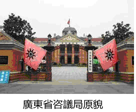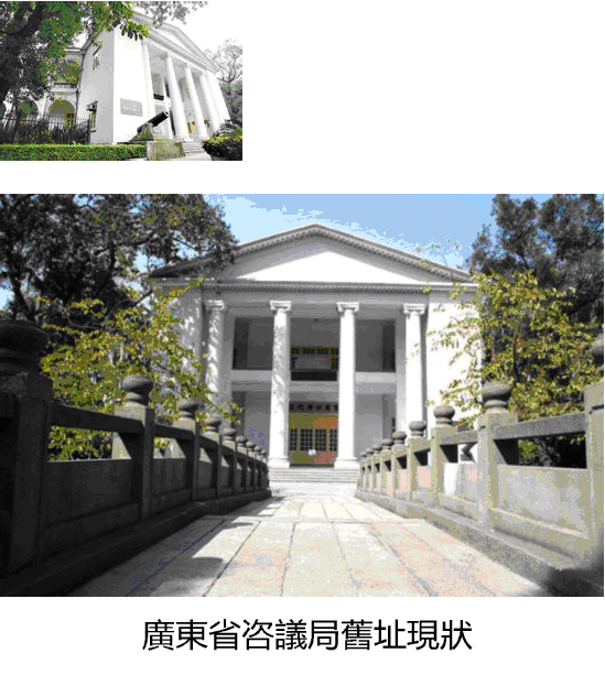 宣統元年(公元1909年),攝政王載灃(1883~1951)命各省根據《咨議局章程》設立咨議局。至1909年9月,全國除新疆外各省都設立了具有地方議會性質的咨議局。並於10月14日同時召開第一次常年會。1910年10月3日又召開第二次常年會。1909年2月,兩廣總督張人駿著手成立 廣東咨議局籌備處,他聘請鄧華熙、張振勛、丘逢甲等22人為“議紳”,又向留日學生金蒲崇、金蒲芬等人籌得資金,選址大東門外,興建廣東咨議局大樓。咨議局坐北朝南,正面開闊地帶有一石拱橋連接入口前草坪直達位於大東路(今中山三路)的大門,成為出入該樓房的通道。石橋兩側各有大小相同的石砌荷花池,置有石 扶欄。由主樓——草坪——荷花池、石拱橋——大通道——大門形成中軸線,整個建筑群體配置頗具氣勢,中西方建筑風格融為一體,既有羅馬式圓形柱廊建筑風格,又 不乏中國園林建筑的小橋流水。