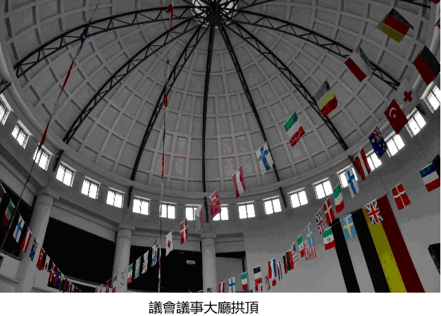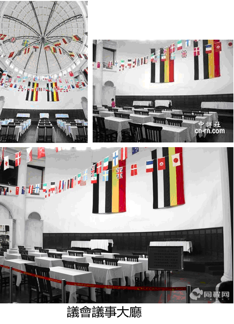進得門來迎面就是中央大廳,雖是百年前的建築,但我們仍被它的拻宏氣勢震撼了:抬頭望是一個即使今天也不多見的碩大的鋼架結構的圓拱屋頂,根部設一圈玻璃百頁窗,終日有柔和的陽光透入,拱底有數根小繩張掛着五彩繽紛的「萬國旗」予人一種「光明世界」的感覺。地面上, 四排桌子和座椅整齊地排列著,桌子鋪上白布,面對著正前方的主席台,高大的墙壁上懸掛着幾面大型的象徵漢滿蒙回藏五族共和的紅黃藍白黑「五色旗」,两面側墙還懸掛着辛亥革命最初使用過的十八角星旗。與主席台正面相對的大廳後壁,挂著巨大的孫中山戎裝照。照片下方,一台小型播放器重 復播放孫中山呼吁大眾要「警醒警醒」、「拿革命作用來救中國」的原音,令游人穿越歷史長河,仿佛親身聆聽孫中山先生的教誨。踏進此間,令我有一種莊嚴肅穆的感覺,因為我覺得比起全國各地共產黨投巨資營造及鋪天蓋地宣揚之所有的「革命聖地」、「革命紀念館所」,這裏才是最值得中國人紀念和景仰的地方,理由很簡單:共產革命雖然確實犧牲重大、艱險萬分,但究其實質不過是一塲在錯誤外來思想和理論指導下的農民加上痞子流氓的暴力革命,這塲革命的結果是中斷了中國走向民主憲政的過程,强行社會主義大試驗,導至了「千百萬人頭落地」,國民經濟瀕臨崩潰的邊緣,十幾億大陸同胞至今仍活在獨裁專制統治之下的惡果,理應遭到人民大眾的清算,談何「紀念」?而辛亥革命的目標是建立民主共和,雖然因為各種原因比人民大眾原來期望的目標和進程延誤了很多很多,但是,歸根到底,孫中山先生「三權分立、五權憲制」的民主憲政理想最終還是在今天的台灣實現了。這是值得我們全體中國人慶幸和驕傲的地方。而當年的廣東省咨議局正是這個民主憲政理想起步的地方,因此我認為,這裏不但是中國革命的聖地,更是中國民主的聖地!令我感到莊嚴肅穆的另一個原因是因為這裏曾經是辛亥革命後廣東省臨時省議會和正式議會辦公和會議之處,而先祖父容伯挺,曾任廣東省議會的首席議員和代理議長,同時作為國會議員,参與了當年力主走憲政民主道路的國會議員派系組織「政學系」的許多行動,甚至為此獻出了自己寶貴的生命。我由此想像他在這裏出進忙碌的形象,甚至設想着當年他曾坐在哪一個座位上?緬懷先輩,油然而生一種莊嚴肅穆的感覺,這是一種很自然的感情。