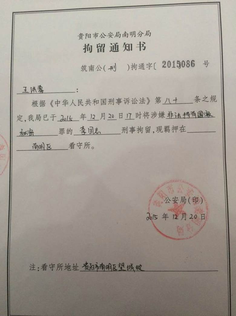 在经过十天的行政拘留,本该昨天被释放的 #贵阳活石教会 李国志(仰华)牧师,今天他的家属收到以非法持有国家秘密为由转为刑事拘留的通知。而昨天他的夫人在去看守所接人时看到牧师黑头套蒙面被四个人带上一辆没有牌照的面包车带走。 View translation