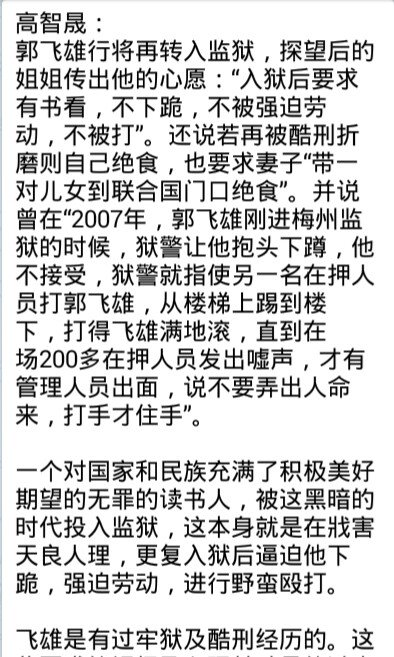 郭飞雄二审至今25天,还未转到监狱。律师、家人均无法探视。