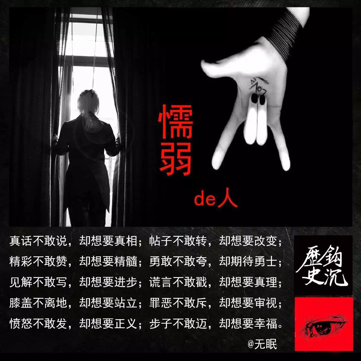 无眠:真话不敢说却想要真相;帖子不敢转却想要改变;精彩不敢赞却想要精髓;勇敢不敢夸却期待勇士;见解不敢写却想要进步;谎言不敢戳却想要真理;膝盖不离地却想要站立;罪恶不敢斥却想要审视;愤怒不敢发却想要正义;步子不敢迈却想要幸福。