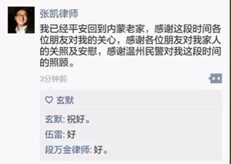 張凱律師二十分鐘前在微信朋友圈發出消息:我已经平安回到内蒙老家,感谢这段时间各位朋友对我的关心,感谢各位朋友对我家人的关照及安慰,感谢温州民警对我这段时间的照顾。