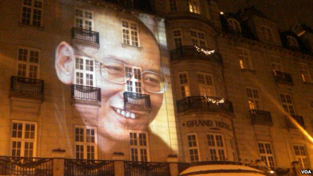 2010年12月10日,人权活动人士在诺贝尔和平奖晚宴地点奥斯陆大酒店正面外墙投放刘晓波巨幅头像。这位中国异议知识分子因身陷囹圄而缺席颁奖活动。