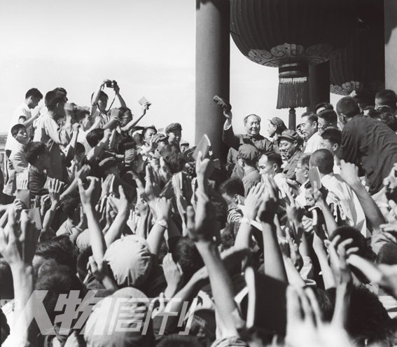 1966年8月18日,毛泽东在天安门城楼上和革命群众在一起