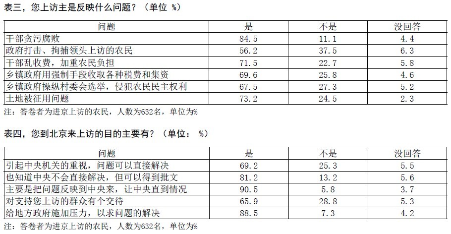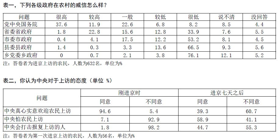 表二通过对56位第一次进京上访的农民在不同时期的对比性调查发现,刚进京上访时,农民对中央的认同是非常高的,认为“中央真心实意欢迎农民上访”的高达94.6%,而七天后则下降到39.3%。而认为“中央怕农民上访”的则从7.1%上升到58.9%;认为“中央会打击报复上访的人”从1.8%上升到60.7%。另据对632位进京上访农民调查,有74.2%的认为,包括党中央国务院在内对他们所反映的问题“都推来推去”没有决心解决。一份在北京上访村流传甚广的署名为“亿万冤民者”的传单就称“想起国务院,好似阎王殿,外边是疯犬,里边是贪官”。从早几年听到的“中央是恩人”到直接质疑党中央和国务院的这一变化,是非常值得警惕的。这在很大程度上说明了,进京上访成为了中央政治权威流失的重要渠道。