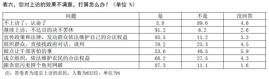 表六的调查和分析表明,目前我国的信访制度存在着重大的制度性缺陷并产生了十分严重的政治后果,因此必须进行彻底而系统的改革。2004年10月,这份调查报告通过中国社会科学院系统上报中央最高领导人后获得了重视,信访改革被中央政府提到了议事日程[7]。