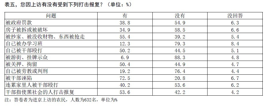 据我们对560名进京上访群众的问卷调查,有71.05%的人认为,新《信访条例》实施以来,地方各级政府对上访人的打击迫害更为严重;有63.9%的人表示曾因上访被关押或拘留;有18.8%的人表示曾因上访被劳教或判刑。这些信访群众进京上访的主要目的,就是要中央对他们因上访遭受打击迫害给说法[27]。