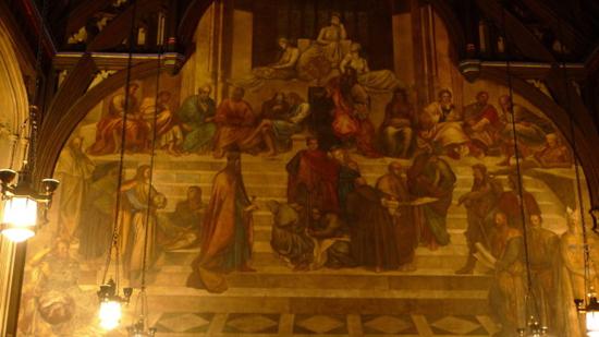 也许是中午的缘故,我们在林肯会馆大堂里的午餐没有太多仪式。这座大堂于1843年奠基,落成于1845年。那一年的10月30日,维多利亚女王出席了盛大的启用仪式。我们午餐的这个大厅是整座建筑的中心。一条条餐桌整齐排列,阳光透过高耸而狭长的彩绘玻璃照射进来,给这个厅堂增添了神圣而静谧的气息。四周墙上悬挂着许多人物的画像和照片,陈列着一些半身塑像,都是该馆历史、也是英国历史上的重要人物:从马修·黑尔、托马斯·摩尔,一直到丹宁勋爵和撒切尔夫人。高桌上方挂着一幅巨幅油画,画的是人类文化史和法律史上的重要人物。彭教授说其中有孔子,但是我端详许久,终于没有辨认出哪一位是中国的至圣先师。