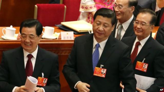 2013年人大会议开幕式后的习近平及其前任胡锦涛及温家宝总理。何清涟认为,习近平接过来的摊子太破,不能象胡温那样吃环境资源