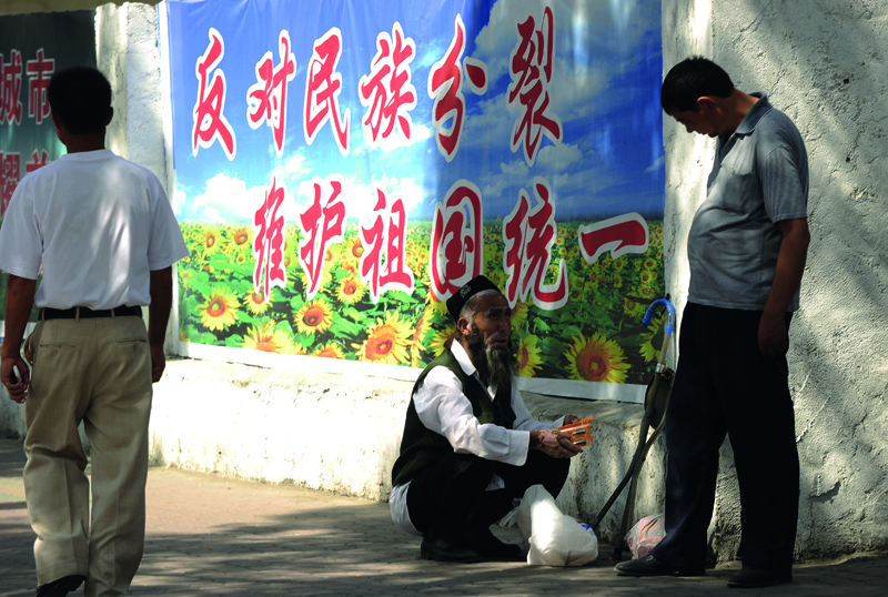 烏魯木齊街頭的維穩標語與維吾爾商販