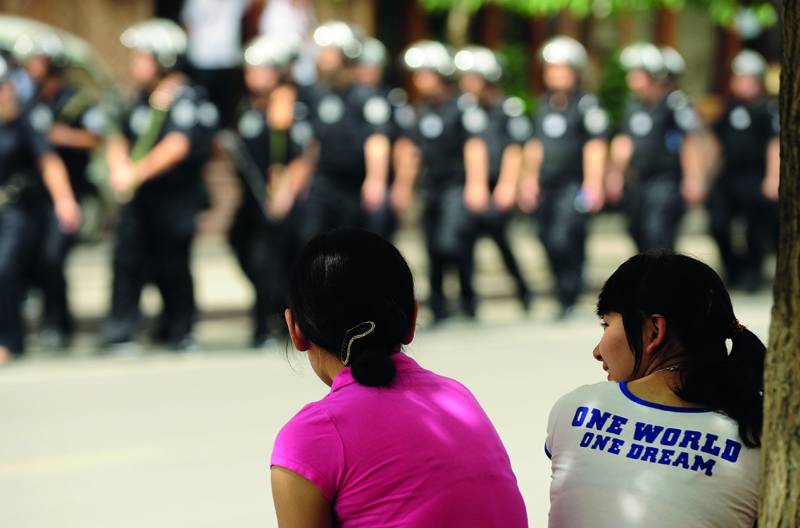 烏魯木齊街頭維族少女注視在街頭巡邏的防暴警察